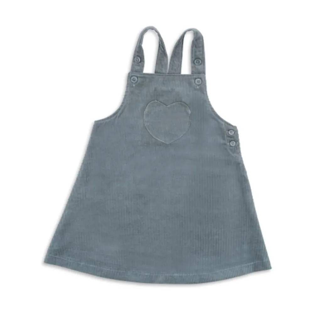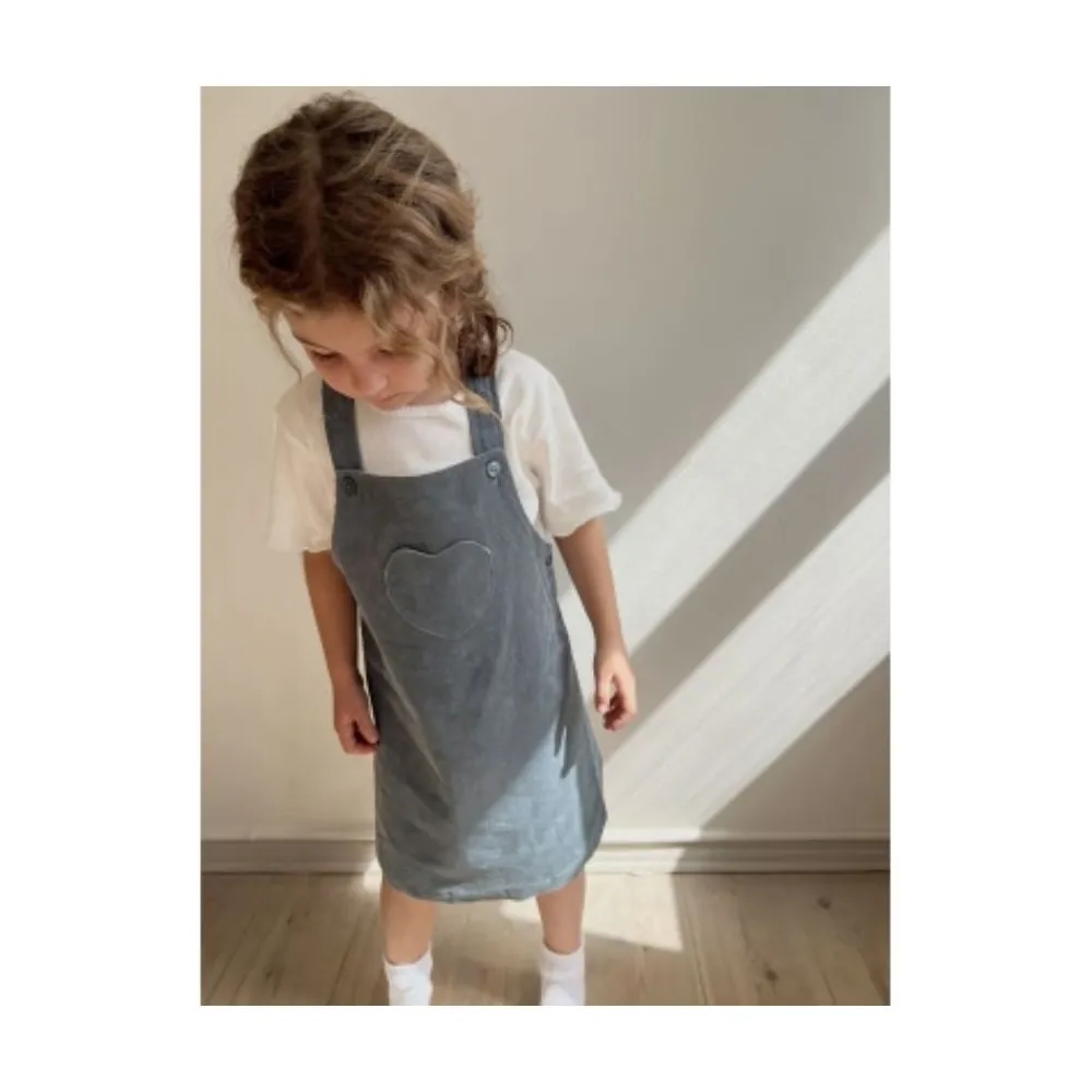 Kjole laget i 100 prosent økologisk bomull. Designet med knapper på stroppene og sidehoften. Har en hjerteformet lomme på brystet.