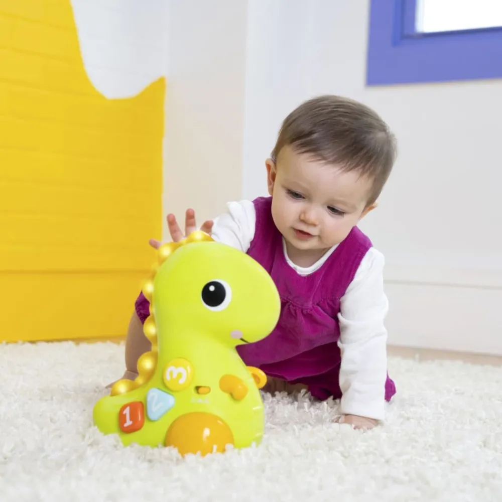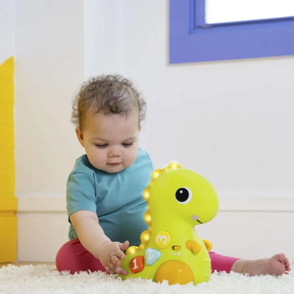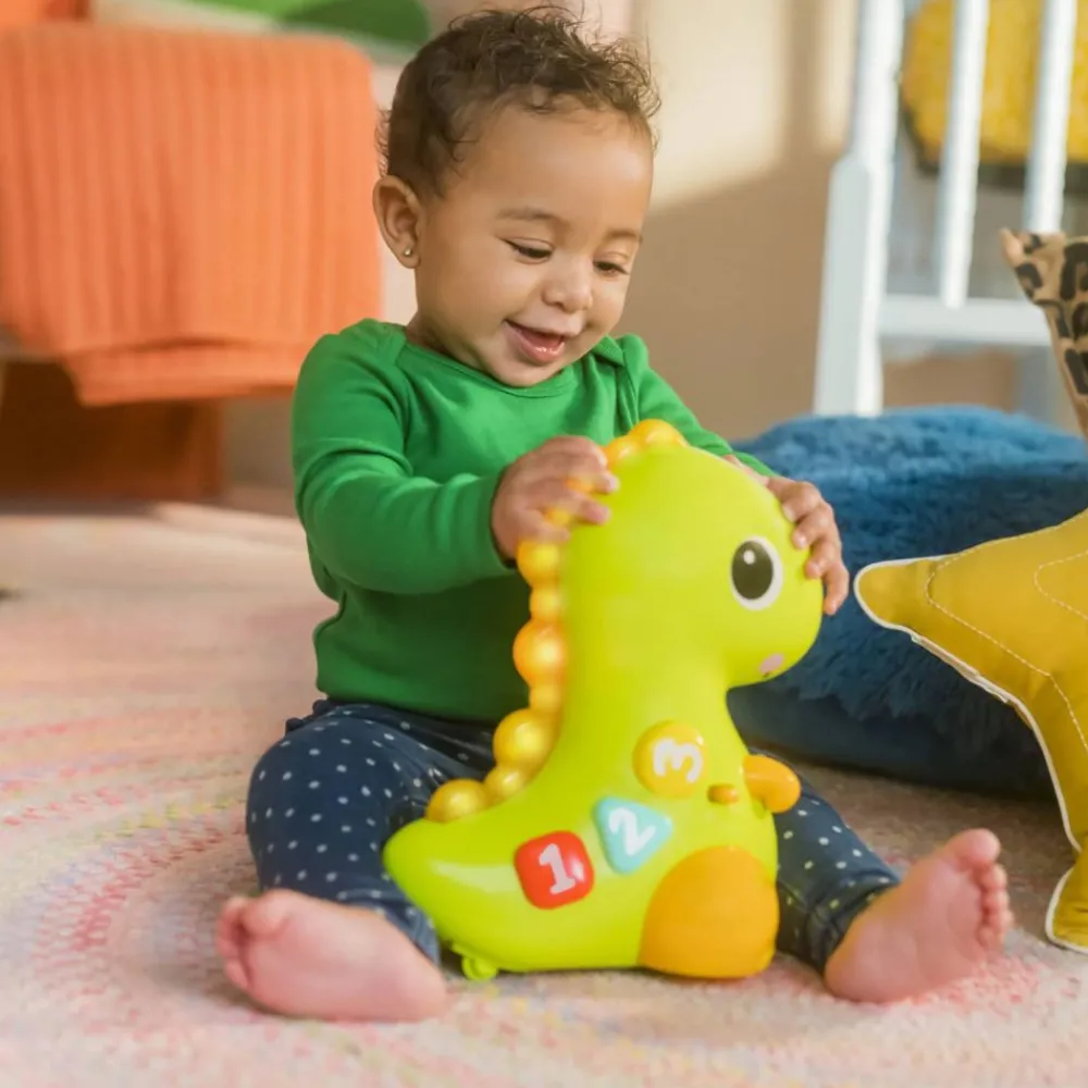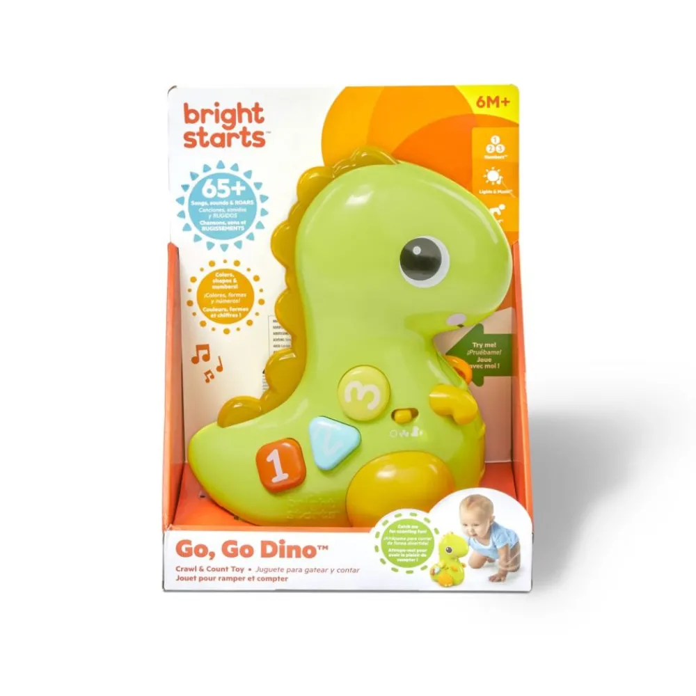 Nedtelling til en krypende jakt på 3, 2, 1. GÅ! Go, Go Dino musikalske lys-opp dinosaur-leketøy fra Bright Starts ruller rundt for å oppmuntre babyen til å bevege seg.Her kan barnet oppdage tall, farger og former med knapper som er enkle å trykke på. Bare et trykk på nesen vil aktivere musikk, lys, bevegelse og spennende lyder.
