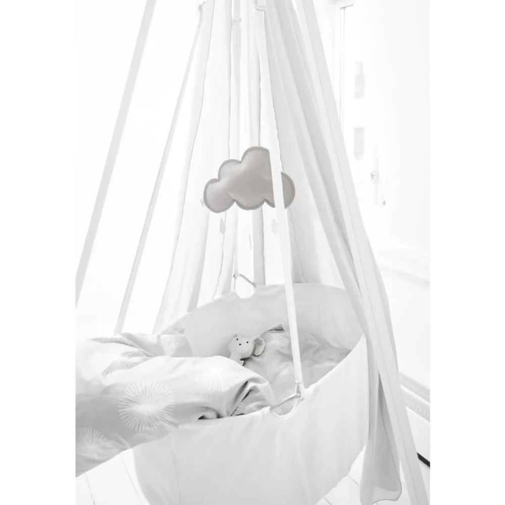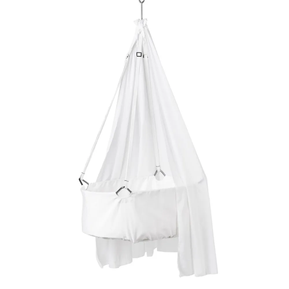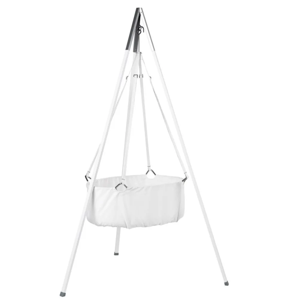 Leander vugge kan henges fra en takkrok eller hvile i rammen. Det er bevegelsesfrihet i alle retninger.