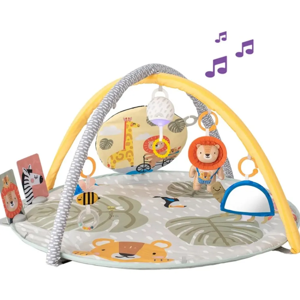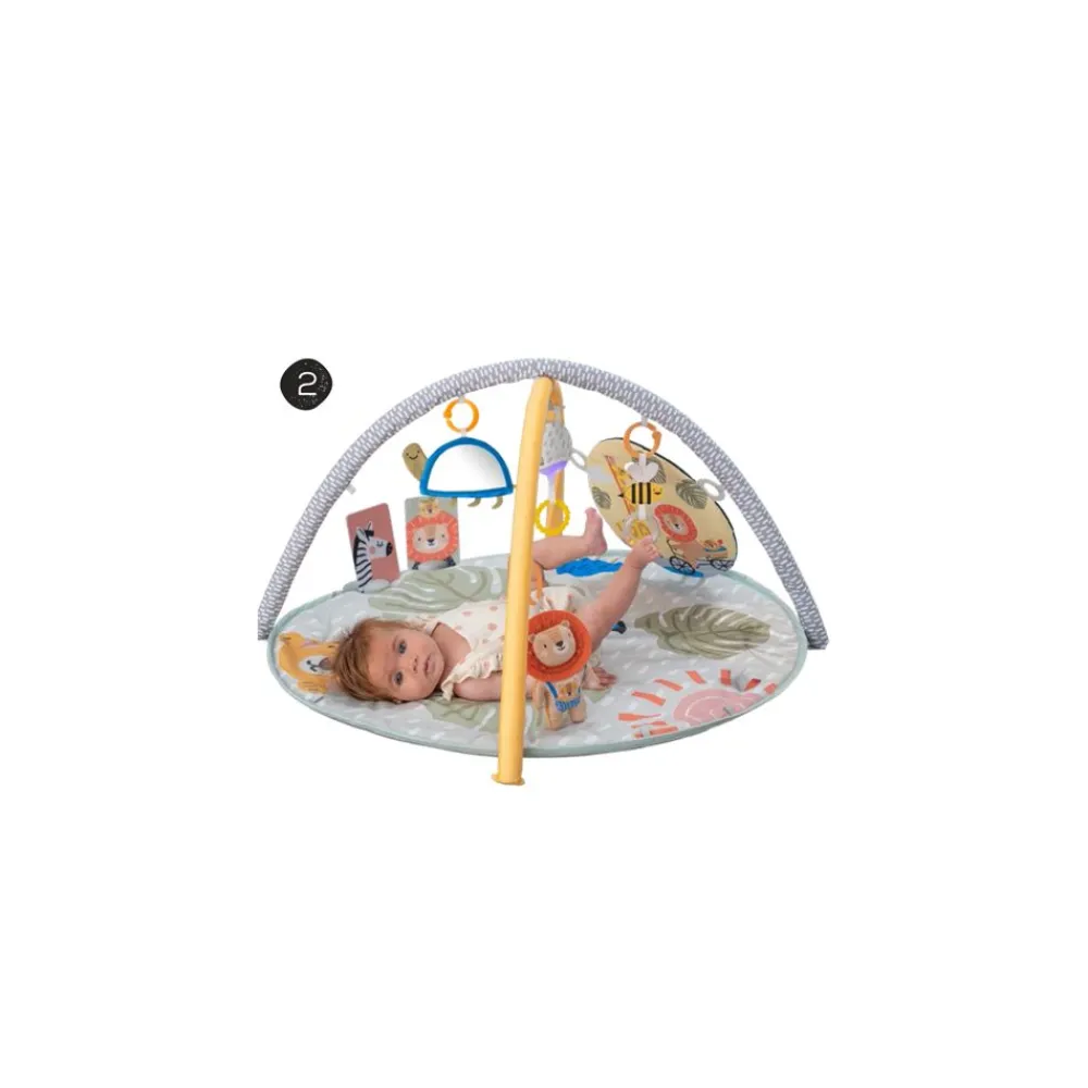 Inkluderer 7 lekne, multi-sensoriske hengende leker: krøllete, rundt teppe, skranglende løven Harry med en manebitring, 2 dobbeltsidige filtkort med 2 unike plastholdere, dobbeltsidig skilpadde med babysikkert speil, rangle for biring og en musikalsk leke med fargerike lys.