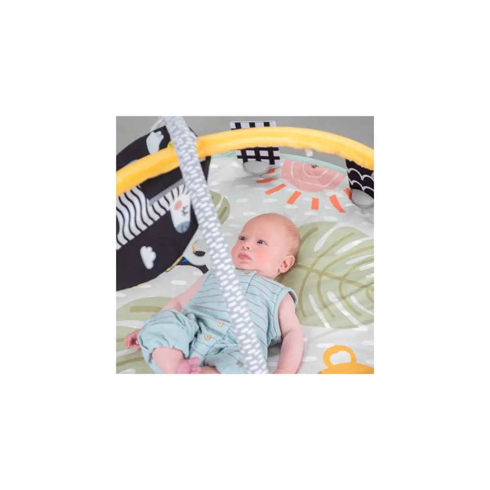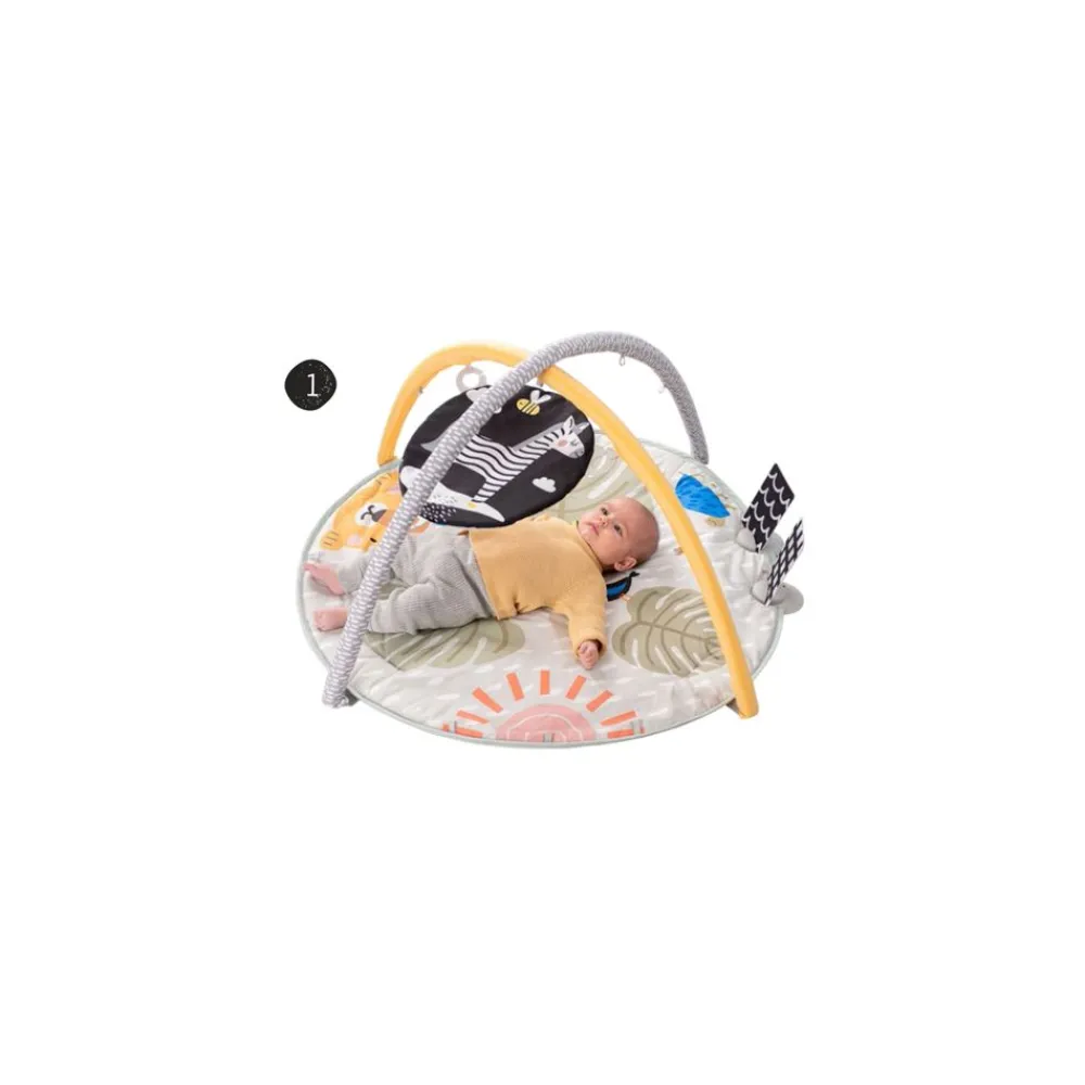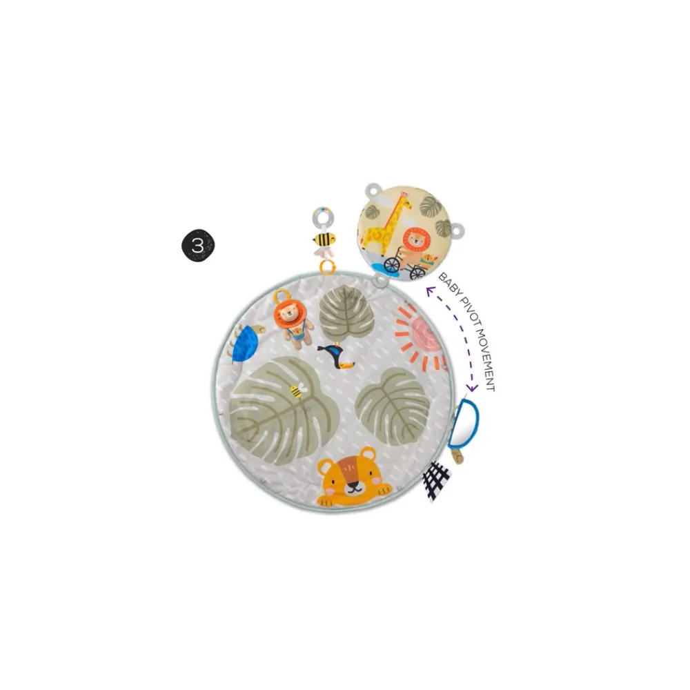 Lekematten kommer med et rundt dobbeltsidig teppe som kan festes i tre forskjellige positurer, og får utviklingsmessige fordeler fra hver posisjon: bakoverliggende, magetid og spark og lek.