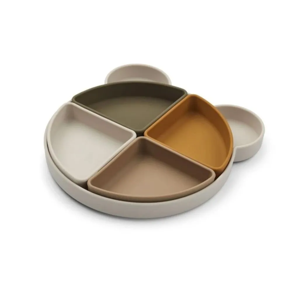 En gøyal tallerken designet for å gjøre måltidet både morsommere og enklere for barn. Ved å dele opp maten i fire separate brett, kan barnet enkelt plukke og velge hva de vil spise først, og blande maten sammen hvis de ønsker det. En tallerken laget av holdbart og bærekraftig materiale, som er enkel å rengjøre etter bruk.