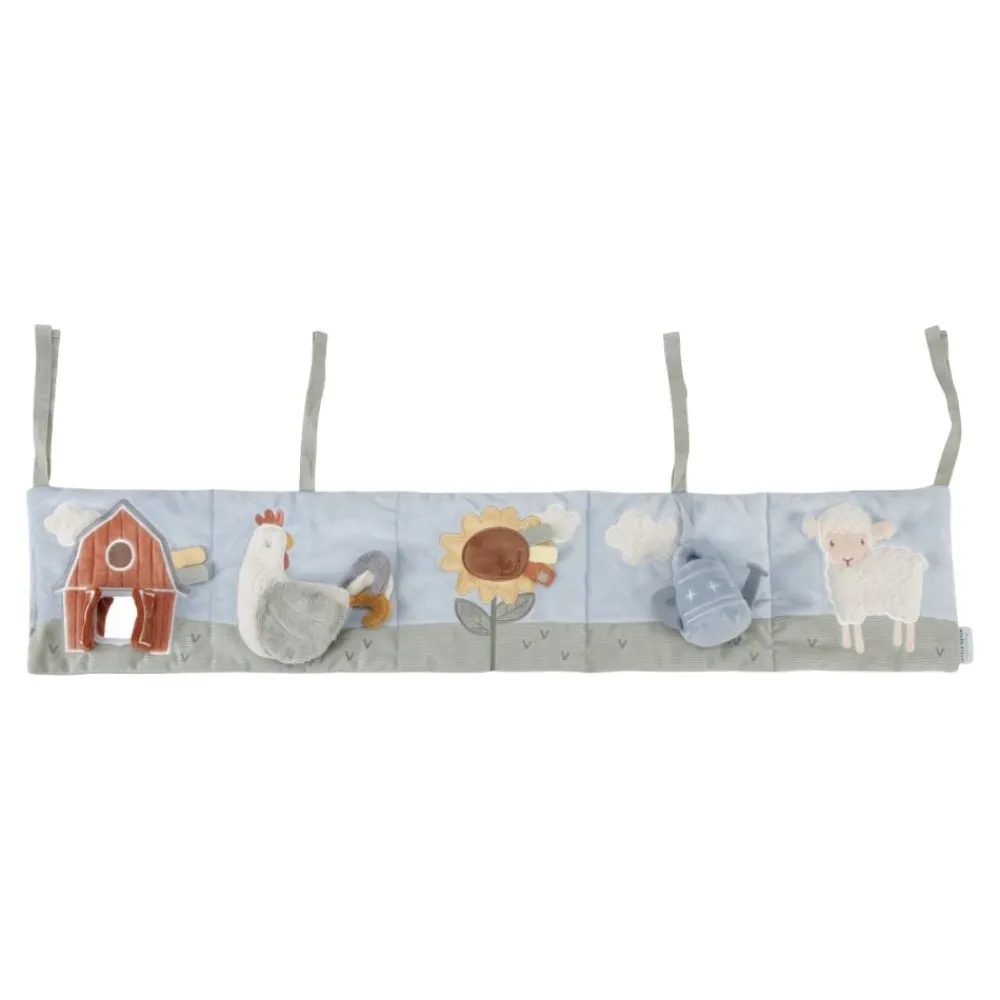 Bli med og lek i lekegrinden eller sengen. La den lille utforske aktivitetsboken fra Little Farm. Her kan barnet kjenne på ulike lapper på låven, se seg selv i speilet, høre knitringen fra kyllingens vinger og raslingen fra vannkannen når den dyttes. Denne morsomme aktivitetskanten stimulerer babyens hånd-øye-koordinasjon og er spennende å utforske både liggende og på magen. Festes enkelt til sprinkelseng eller lekegrind med bomullssnorer.