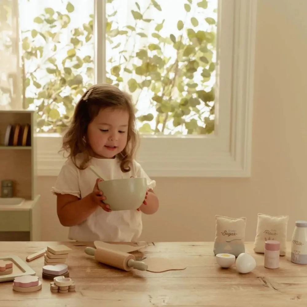 Tid for baking! Med dette flotte bakesettet i tre kan små bakere lage de herligste småkaker og kaker – alt som trengs for fantasifull lek på kjøkkenet.