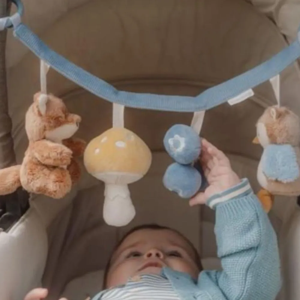 Rasle, knirke, krølle. Utforsk de fire søte små lekene fra Forest Friends-kolleksjonen på denne barnevognslenken. Den nydelige reven, den kloke lille uglen, soppen og grenen av blåbær er her for å underholde under rusleturen. Gi barnet ditt en sanseopplevelse med denne fargerike barnevognlekekjeden, og oppmuntrer utviklingen av hånd-øye-koordinasjon mens du er ute og reiser. Festes enkelt til barnevogner.