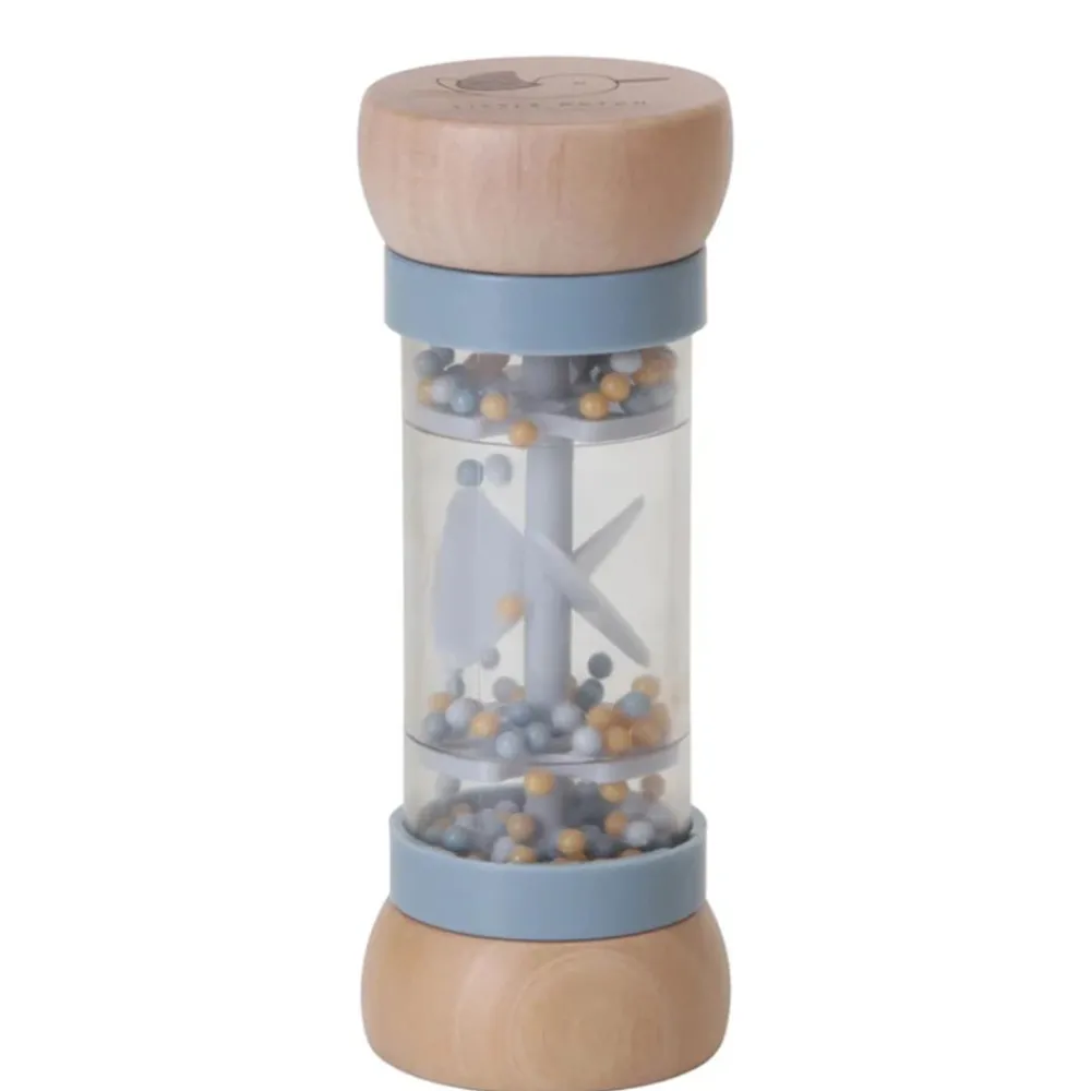 Rist og skrangle! Snu regnskralen og de sildrende perlene vil bevege seg til den andre siden og lage beroligende regndråpelyder. Det vil stimulere babyens sensoriske utvikling og musikalske talent. Kulene i 3 forskjellige farger faller ned i røret gjennom små åpninger og får propellen til å snurre, noe som resulterer i en behagelig lyd. Regnranglen er designet for små hender.