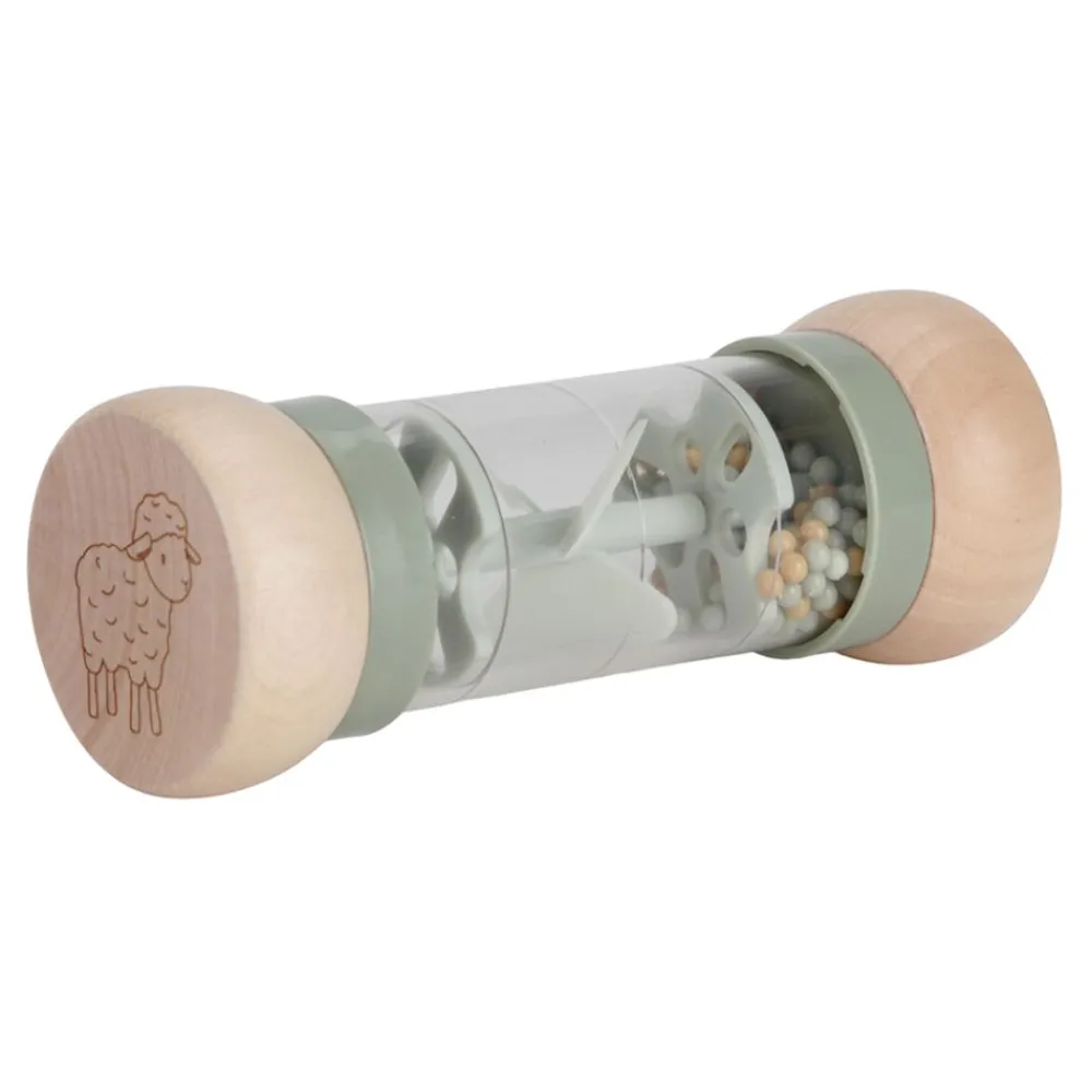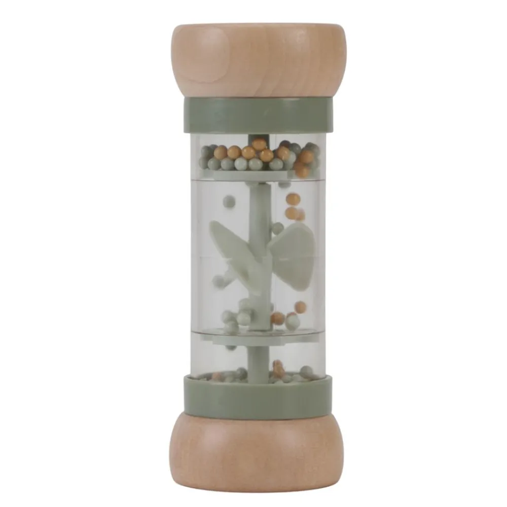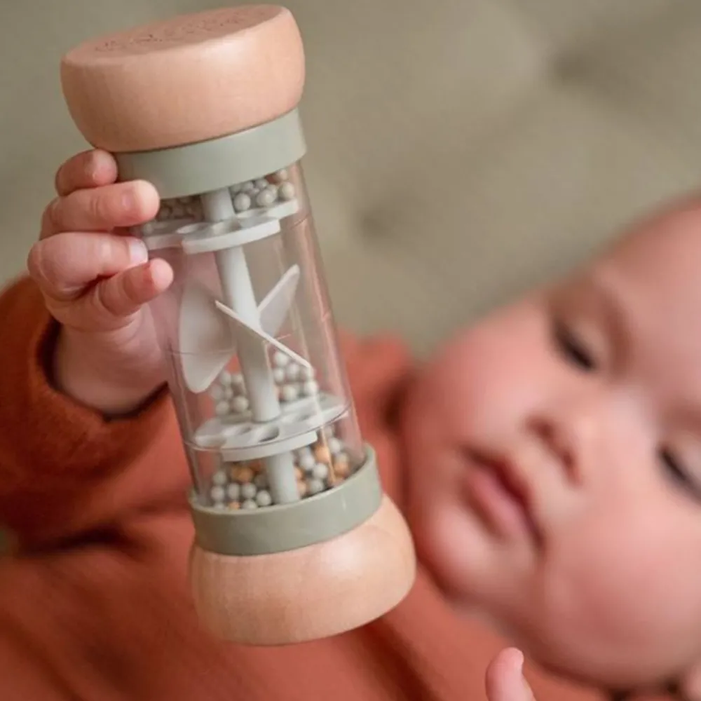 Rist og skrangle! Snu regnskralen og de sildrende perlene vil bevege seg til den andre siden og lage beroligende regndråpelyder. Det vil stimulere babyens sensoriske utvikling og musikalske talent. Kulene i 3 forskjellige farger faller ned i røret gjennom små åpninger og får propellen til å snurre, noe som resulterer i en behagelig lyd. Regnranglen er designet for små hender og et lett grep.