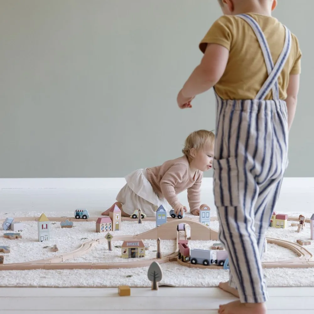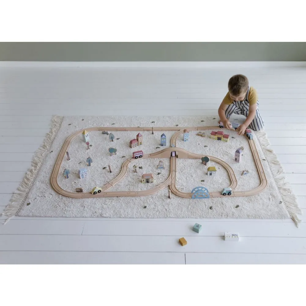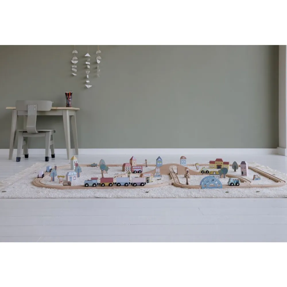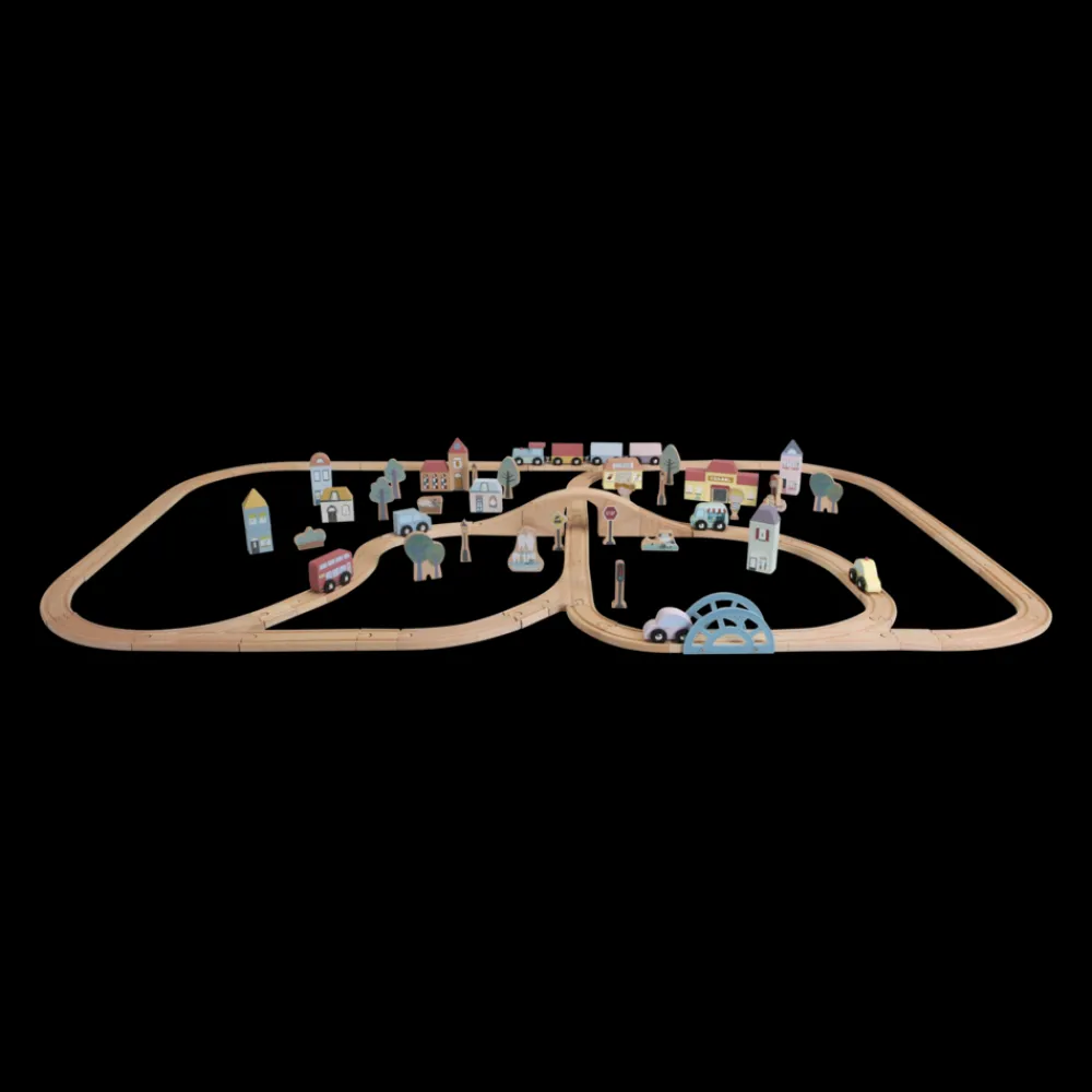 Hopp på tog, buss, taxi eller bil og utforsk byen. Med over 100 deler tilbyr dette settet mange kreative alternativer for å bygge nye kombinasjoner hver gang. Settet inneholder et lokomotiv med tre vogner, rette skinner, kurver, en bro, ulike bygninger, biler, mennesker, trær, blomsterkasser, trafikkskilt, lyktestolpe, lyskryss, buss, isbil, hund og sykkel. Hver trefigur har en detaljert illustrasjon på begge sider. Matchende lekesett, som trebiler, en dyrehage og en garasje.