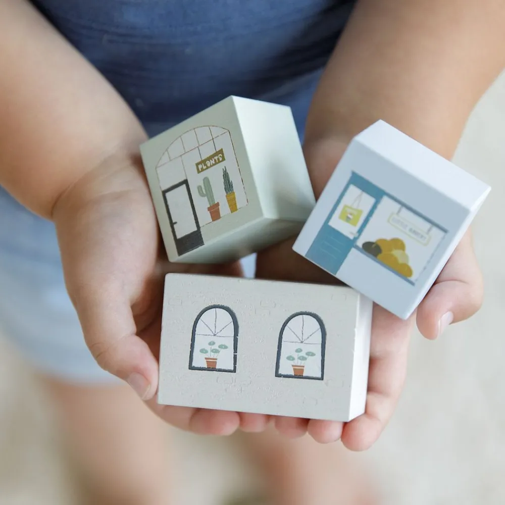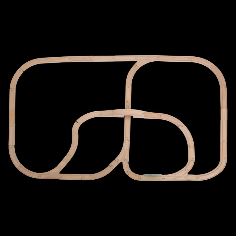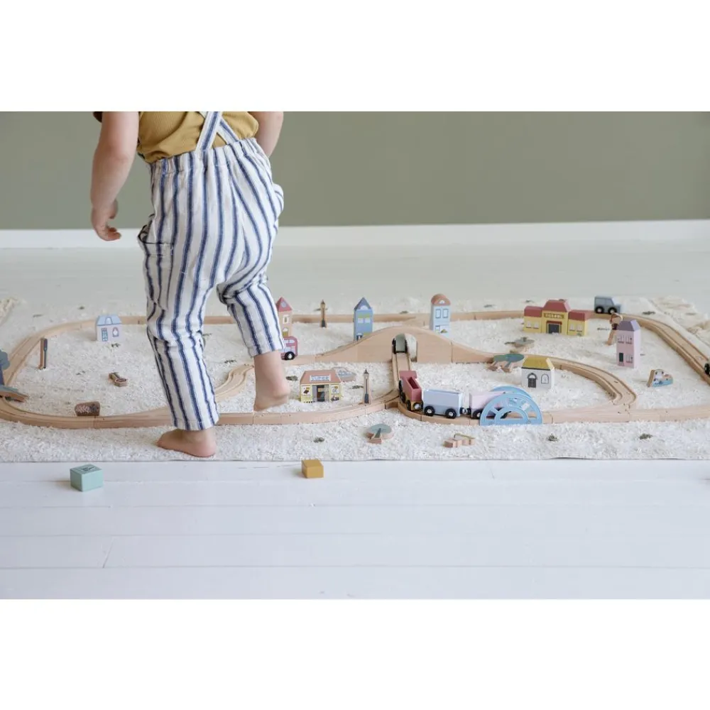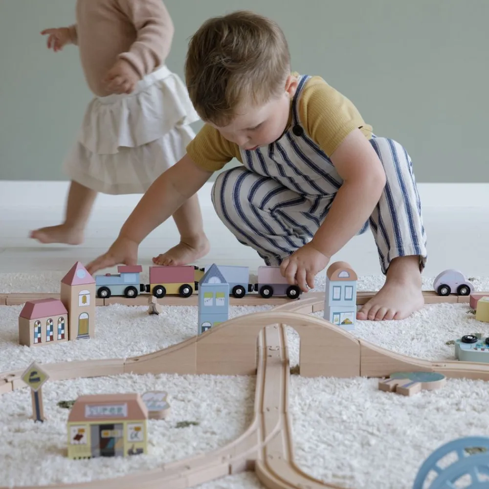 Hopp på tog, buss, taxi eller bil og utforsk byen. Med over 100 deler tilbyr dette settet mange kreative alternativer for å bygge nye kombinasjoner hver gang. Settet inneholder et lokomotiv med tre vogner, rette skinner, kurver, en bro, ulike bygninger, biler, mennesker, trær, blomsterkasser, trafikkskilt, lyktestolpe, lyskryss, buss, isbil, hund og sykkel. Hver trefigur har en detaljert illustrasjon på begge sider. Matchende lekesett, som trebiler, en dyrehage og en garasje.