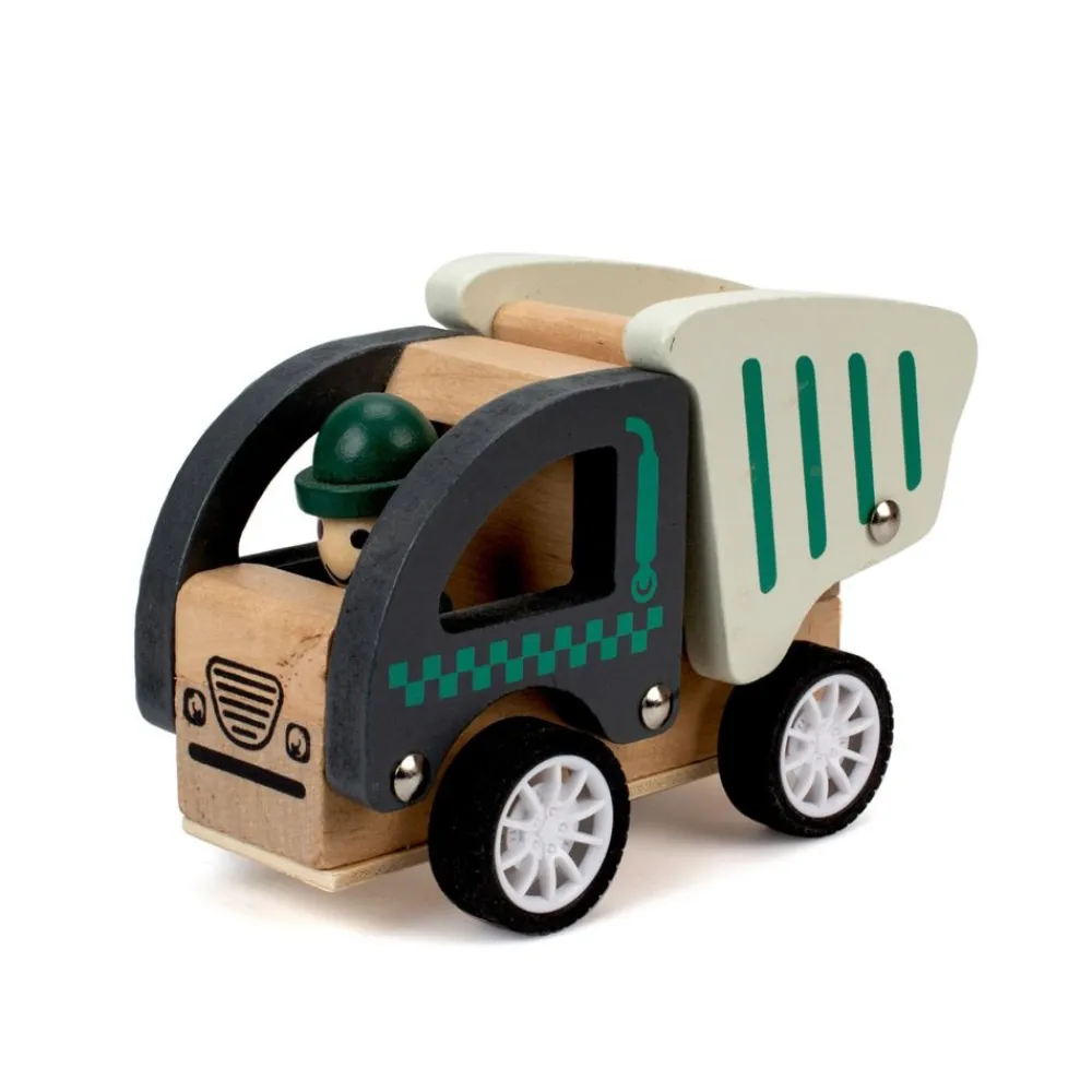 Lastebil med gummihjul og tilbaketrekksfunksjon. Morsom leke for barnet. Bilen er laget i tre og har høy kvalitet.