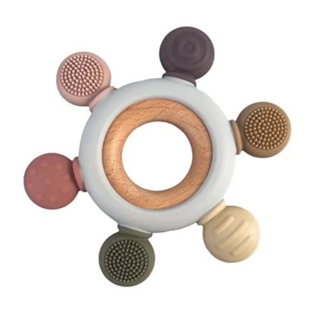 Bitering designet med ulike teksturer og overflater for å gi barnet ulike sensoriske opplevelser. Den er laget av mykt og fleksibelt materiale som er skånsomt mot barnets sensitive tannkjøtt. Dette gjør det til en ideell leke for barn som er i ferd med å få tenner, da den kan lindre ubehag og kløe i tannkjøttet. Samtidig kan barnet utforske og leke med bitringen, noe som kan bidra til å stimulere deres motoriske ferdigheter og utvikling.
