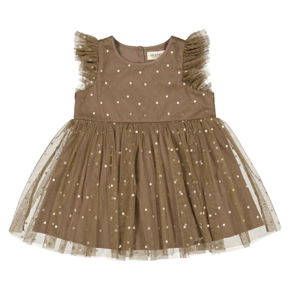 Nydelig Kjole med volum, tyll og vakre gullprikker. Lengden på kjolen går over kneet.