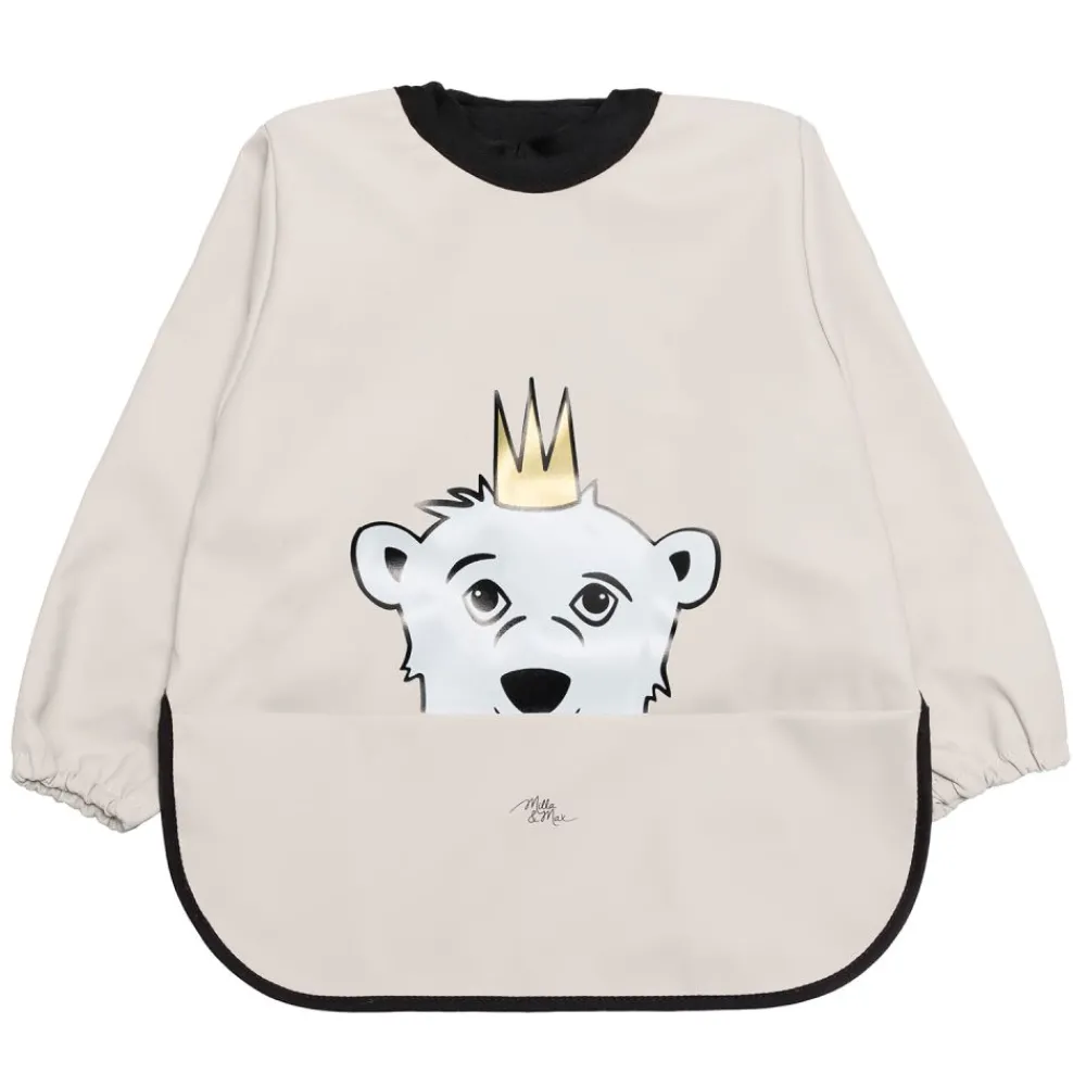 Denne populære langermede smekken fra Milla&Max med høy hals forhindrer søl fra å trekke ned i klærne, mens strikken rundt håndleddene stopper maten fra å snike seg inn. Den store oppsamlingslommen med vannavstøtende innside fanger opp matrester og er lett å skylle ren. Laget av mykt, PU-belagt polyester, tørker den raskt og er enkel å justere med borrelås. Perfekt for små utforskere ved matbordet.