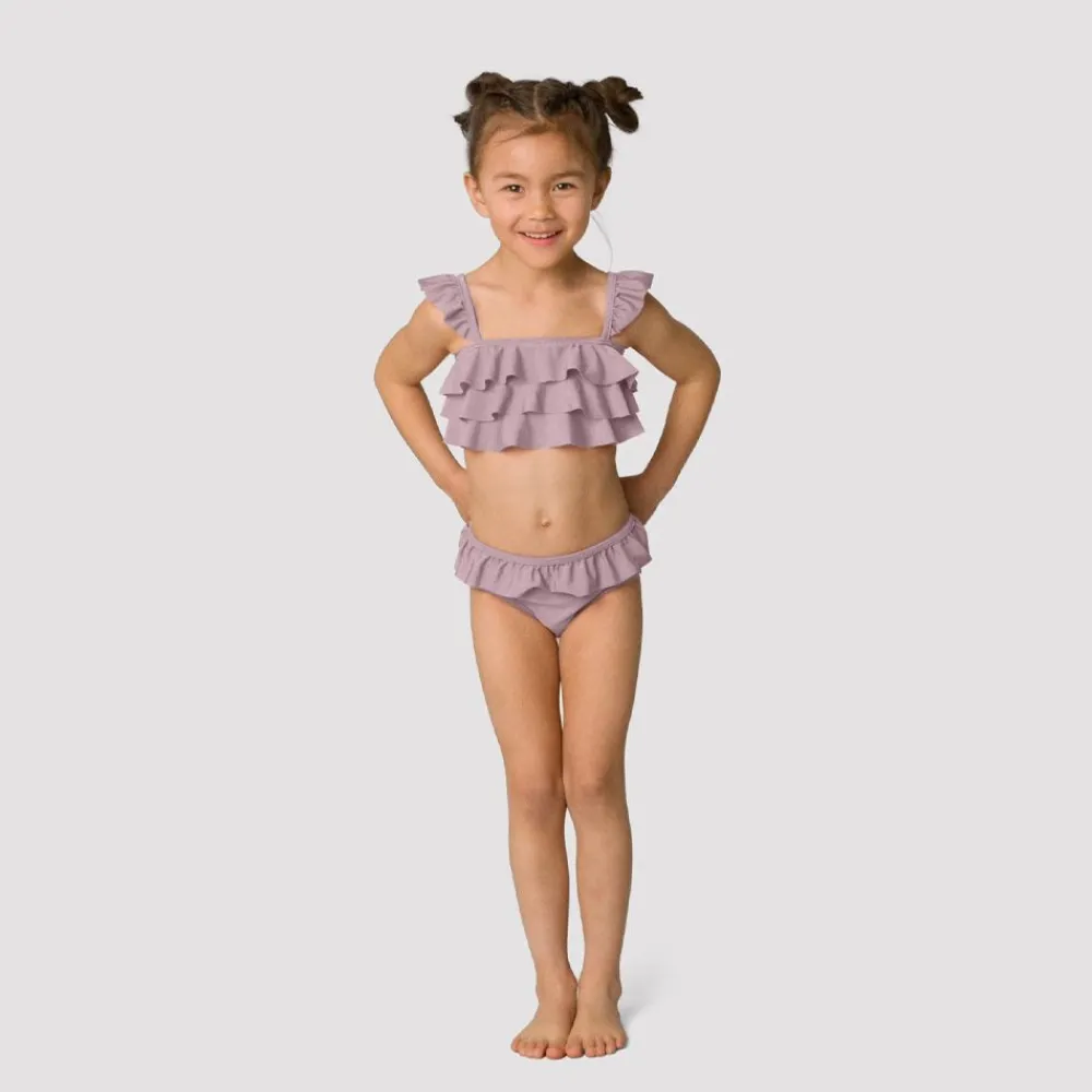 Denne fantastiske bikini’en har en utrolig søt og feminint design. Foran på overdelen og langs skulderstroppene finner man vakre lag med volanger som gir et lekent og delikat preg. Overdelen har en smock-rygg som tilpasser seg perfekt kroppen, slik at barnet kan føle seg komfortabel og trygg når de nyter solen på stranden eller ved bassenget.