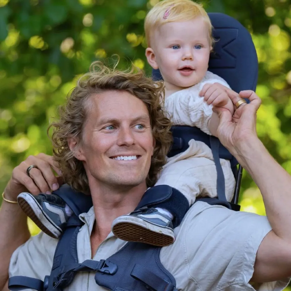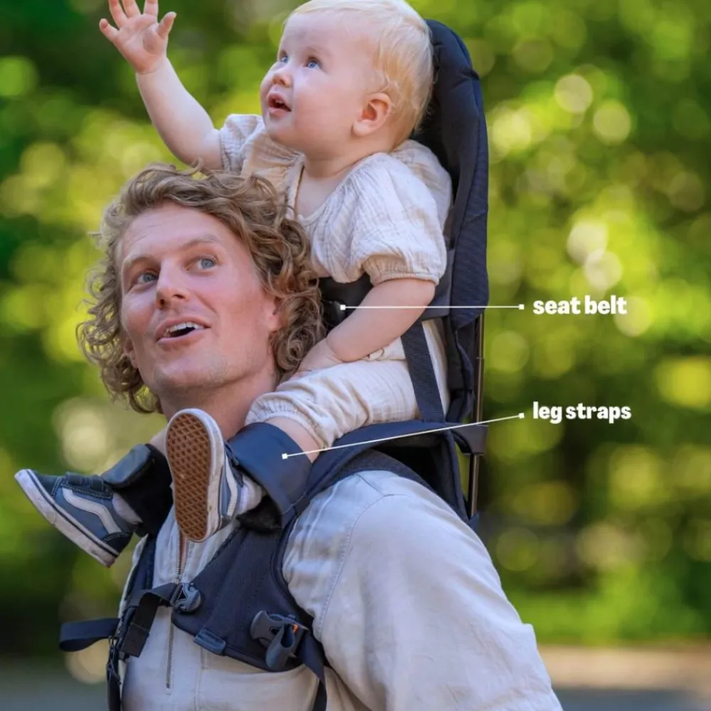 Mens du oppdager verden, sitter barnet trygt på skuldrene dine, sikret med et midjebelte og benstropper. Begge i stilige kunstskinndetaljer. En skulderstropp er inkludert for å gi ekstra støtte for overkroppen til de minste barna (6-10 måneder). Det polstrede setet og den fleksible ryggstøtten gir maksimal komfort mens du nyter utsikten ovenfra!