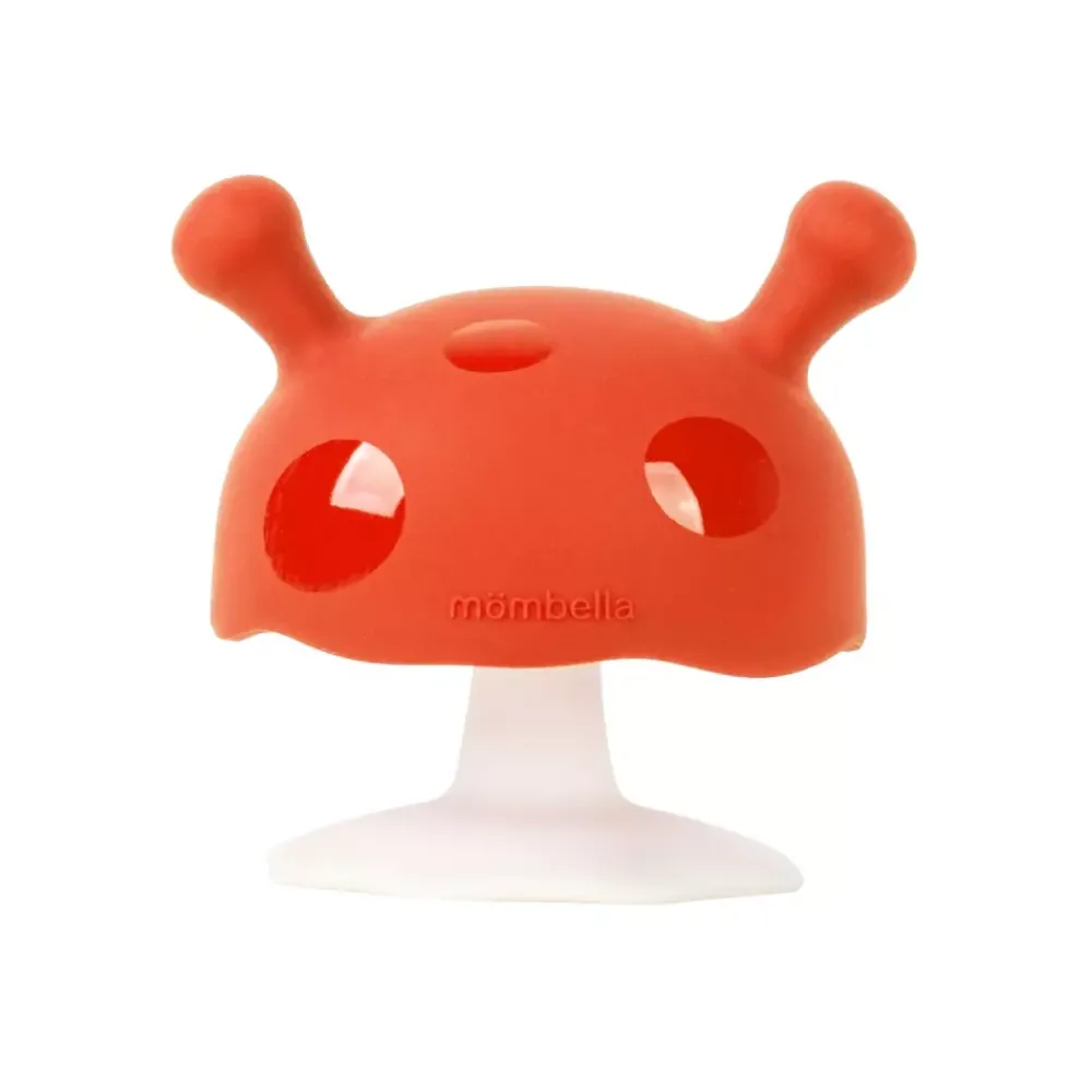 Mombella Mushroom biteleke (Orange) roer urolige babyer, etterligner mammas bryst for dyp beroligelse og lindrer smerter/kløe i gommene. Soppformen ligger naturlig i hånden, bidrar til å forhindre tommelsuging/håndtygging og holder seg i barnets hånd når de sovner. Designet for bruk fra 3+ mnd; ikke anbefalt for barn over 6 mnd.
