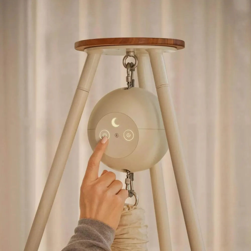 Moonboon Vugge med motor og stativ gir babyen en naturlig, vuggende bevegelse som minner om tiden i magen. Vakker, bærekraftig og enkel å bruke – en komplett løsning for bedre søvn, både dag og natt.