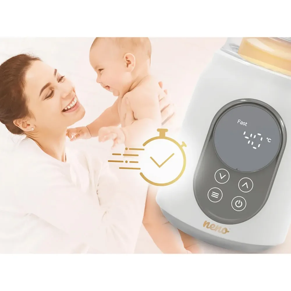 Neno Luna 6-i-1 flaskevarmer og sterilisator med touch-skjerm. Varmer, tiner og steriliserer flasker, smokker og tilbehør på 10 minutter – for enkel og trygg bruk.