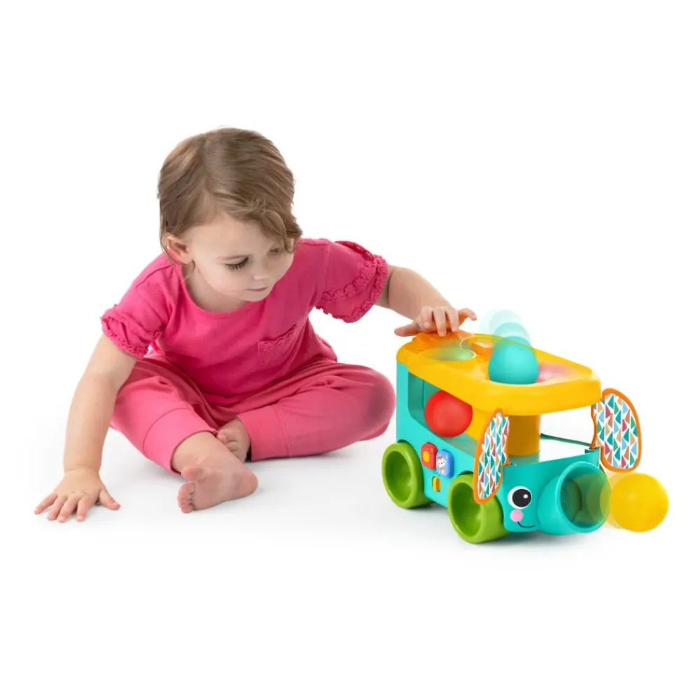 Safaribussen oppmuntre finmotorikken og gi latter og moro. Slipp baller i de to øverste hullene eller klem dem ut av elefantens snabel. – 3 baller inkludert, pluss lys og over 30 melodier og morsomme lyder for å overraske og glede babyen når de setter ballene i; Trykk på sol- og apeknappene for mer tropiske melodier og dyrelyder.