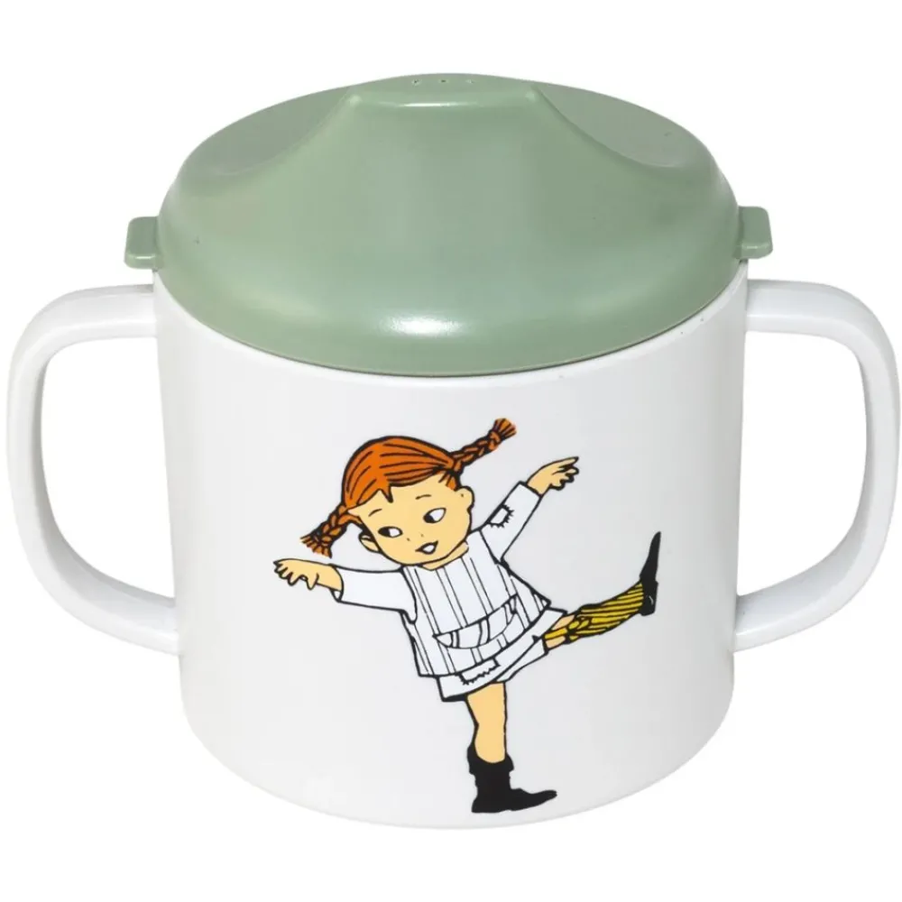 Sølefri Pippi Sirkus tutekopp med håndtak. Søleventilen i lokket gjør at koppen kan holdes opp ned uten å søle ut væsken. Lokket inneholder et søleventil laget av silikon («food grade») som gjør at kruset kan holdes opp ned uten å søle. Ventilen kan enkelt fjernes og vaskes.