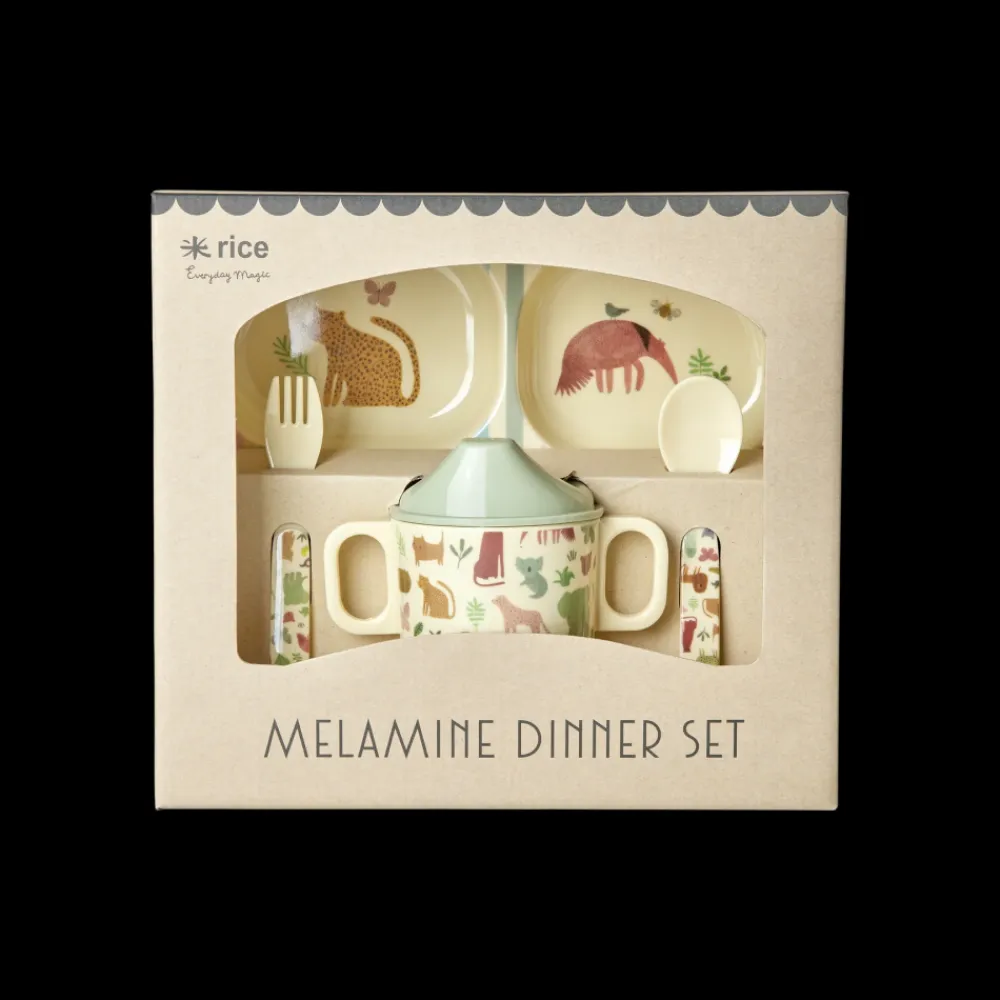 Velkommen til jungelen av glede med dette søte spisesettet i melamin fra RICE. Settet leveres i en fin gaveeske og passer perfekt til familiens minste. Inneholder en tutekopp, skje, gaffel og en tallerken med fire rom – ideelt for å servere ulike smaker og retter på en morsom måte.