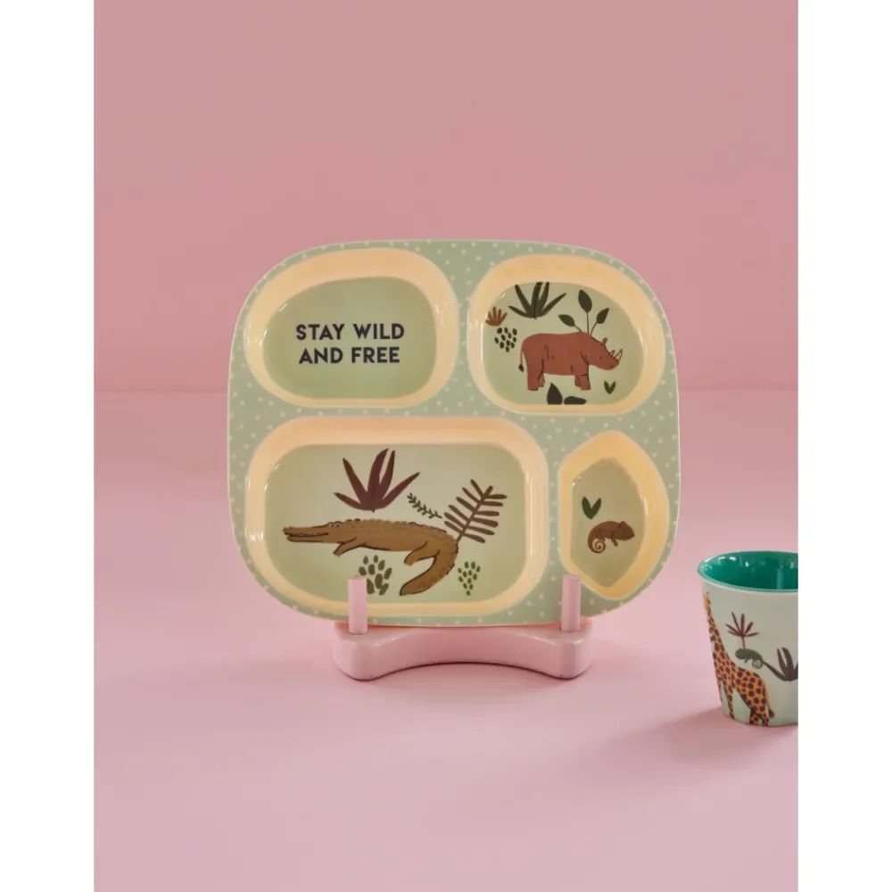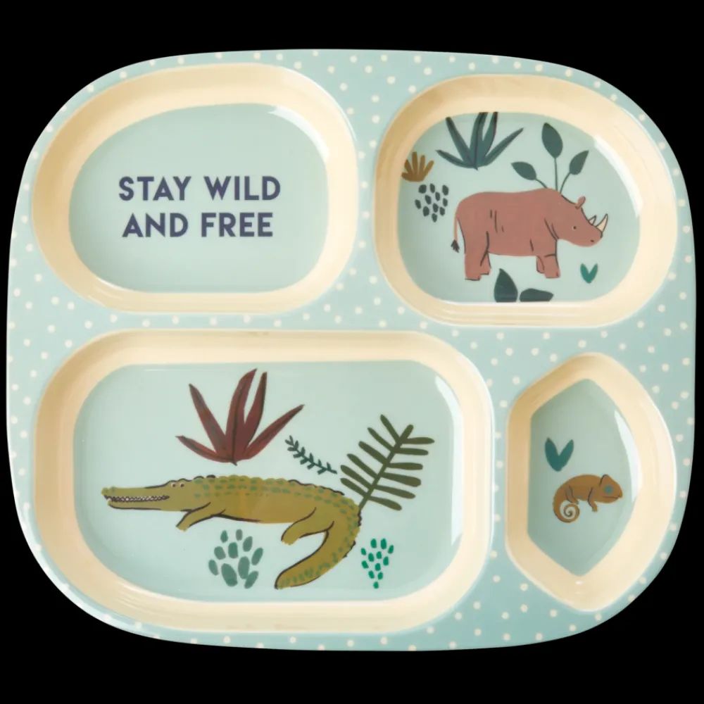Den populære barnetallerkenen i melamin med fire rom og et søtt jungeldesign på blå bakgrunn. Tallerkenen gjør det enkelt å servere ulike typer mat, og lar barna bestemme rekkefølgen selv – perfekt for små som helst vil ha maten adskilt. Praktisk, funksjonell og full av farger.