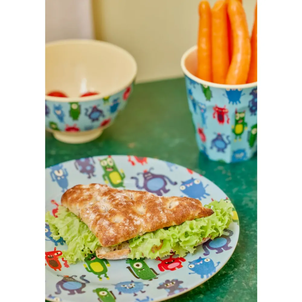 Den populære, runde barnetallerkenen i melamin med morsomme monsterfigurer – noen vennlige, og kanskje noen som prøver å se litt skumle ut. Perfekt til både måltider og snacks.