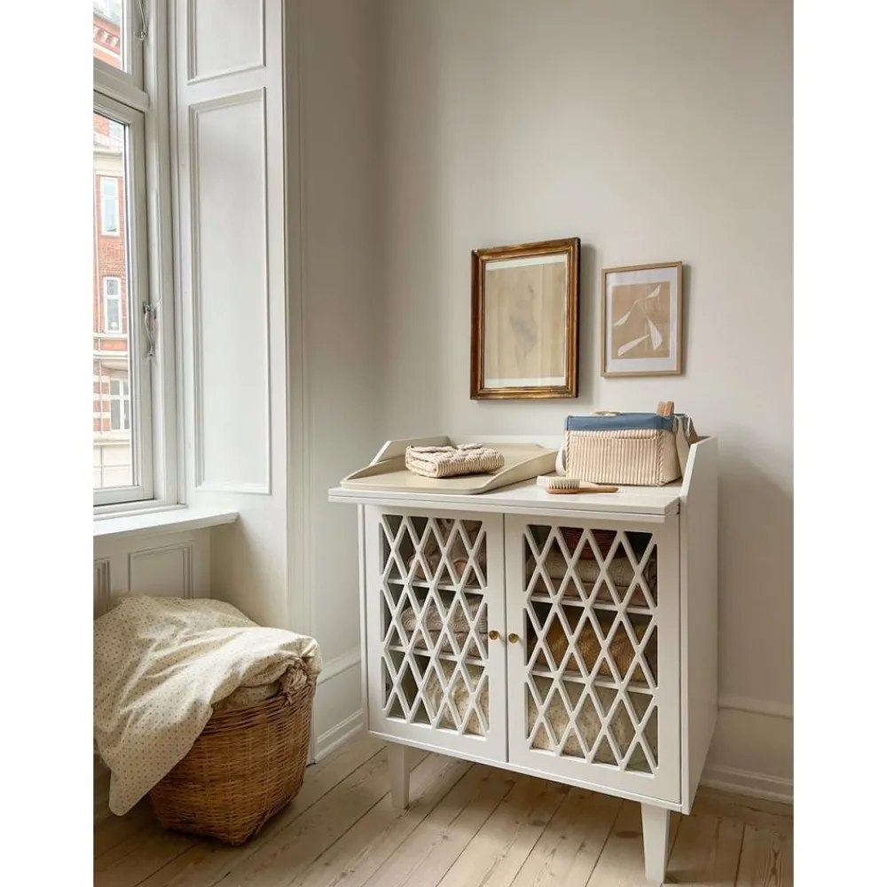 Med Cam Cams ikoniske Harlequin-mønster, elegante messingknotter og soft close-dører, er dette stellebordet en estetisk perle. Plexiglass på baksiden av dørene hindrer støv i å komme inn i skapet, og de justerbare hyllene gir rikelig med plass til alt du trenger på barnerommet – fra klær til nødvendige babyartikler.