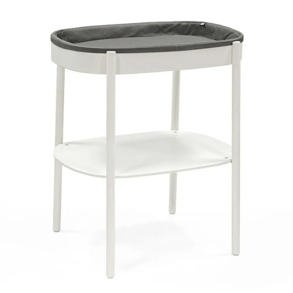 Det ovale stellebordet! Stokke® Sleepi™ Stellebordet gir god plass til foreldrenes føtter under, og kommer i en ideell høyde for å skifte på barnet på den medfølgende myke stellemadrassen. Stokke® Sleepi™ Stellebordet er både allsidig og stilrent, og har en stor hylle for praktisk oppbevaring.