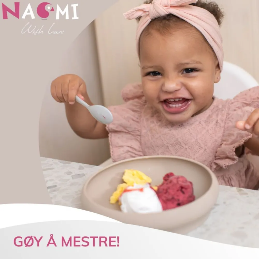 Det å lære å spise kan være frustrerende. Du har kanskje opplevd at de minste barna ikke ønsker hjelp, men likevel ikke klarer oppgaven alene. Med Naomi tallerken vil det bli lett for barnet å spise selv, samtidig som det kan gi mestringsfølelse og glede til hverdagen. Tallerkenen er nett, enkel å bruke og uknuselig, noe som gjør den praktisk også for å ta med på tur.
