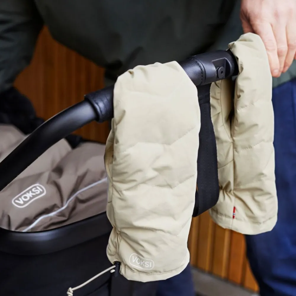 Vottene er designet for å passe alle vogner og hender på trilletur. Fest vottene til vognen ved å åpne borrelåsen på tuppen og plassere dem rundt håndtaket. En enkel snor på siden kan strammes for å hindre kulde i å trenge inn i vottene. De matcher også med Voksi sine vognposer.