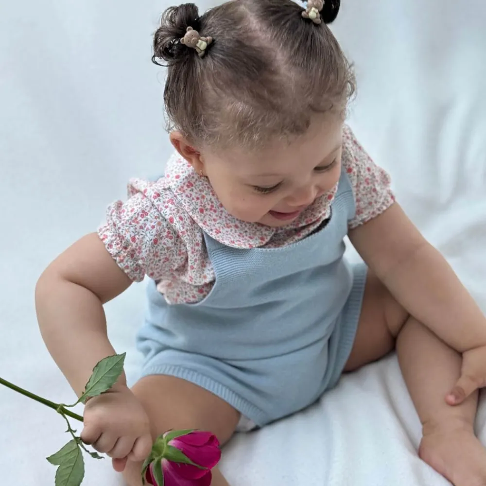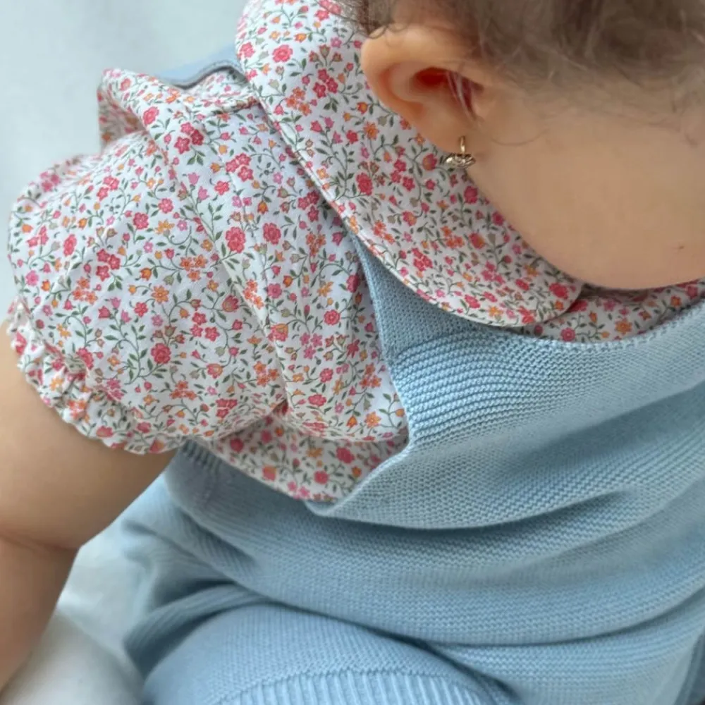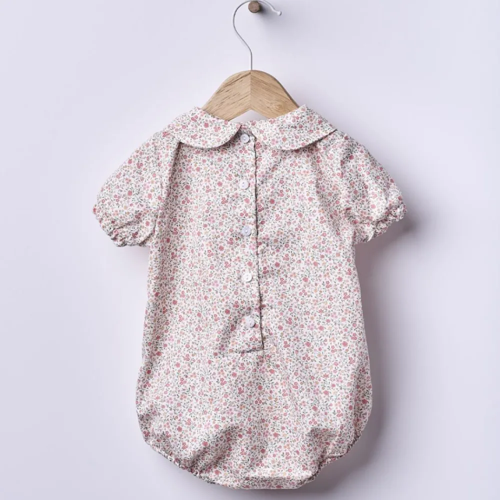 En sjarmerende body med korte ermer og livlig blomsterprint laget i lett og pustende bomull som er skånsom mot babyens hud. Lukkes med perlemorsknapper bak og mellom bena for enkel påkledning og bleieskift.