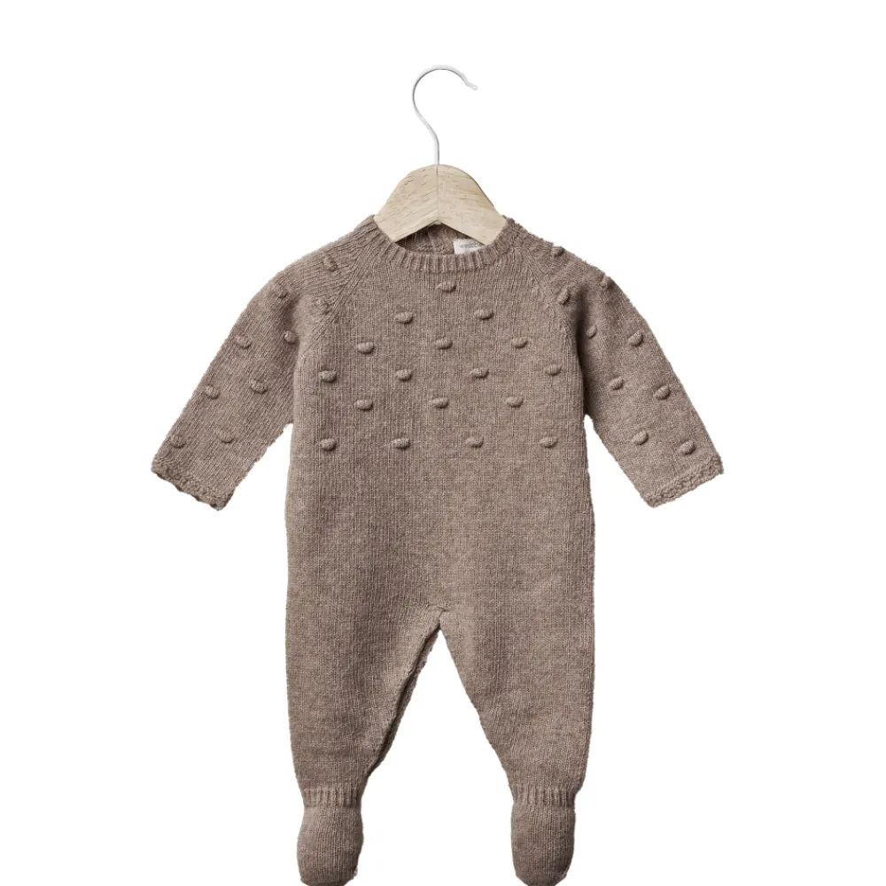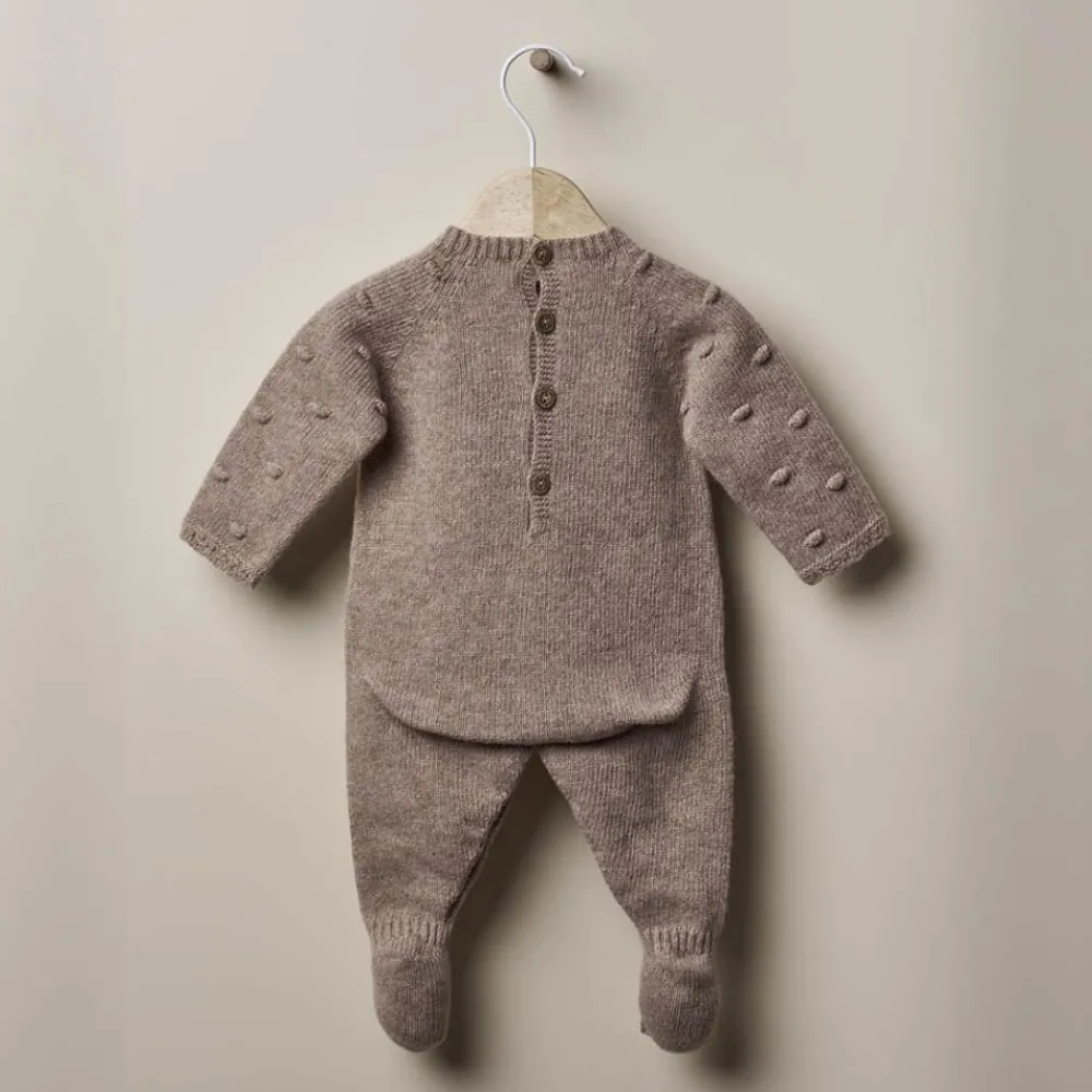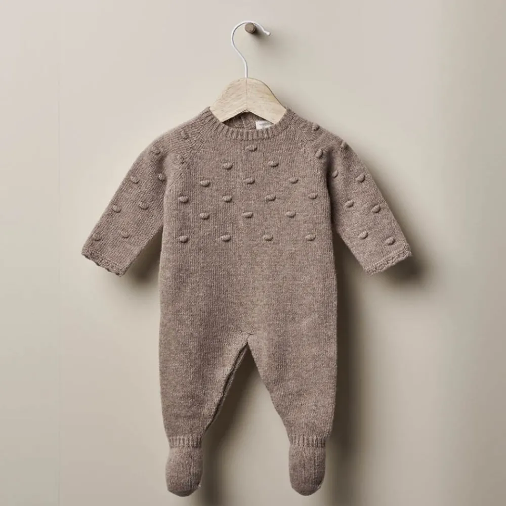 Langermet heldress strikket av myk merinoull. Heldressen er strikket med små pomponger som fremhever stykkets skjønnhet og unike karakter, og festes bak med kokosnøttknapper og mellom bena med trykknapper. Laget med Wholegarment-teknologi, er denne heldressen sømløst for babyens maksimale komfort.