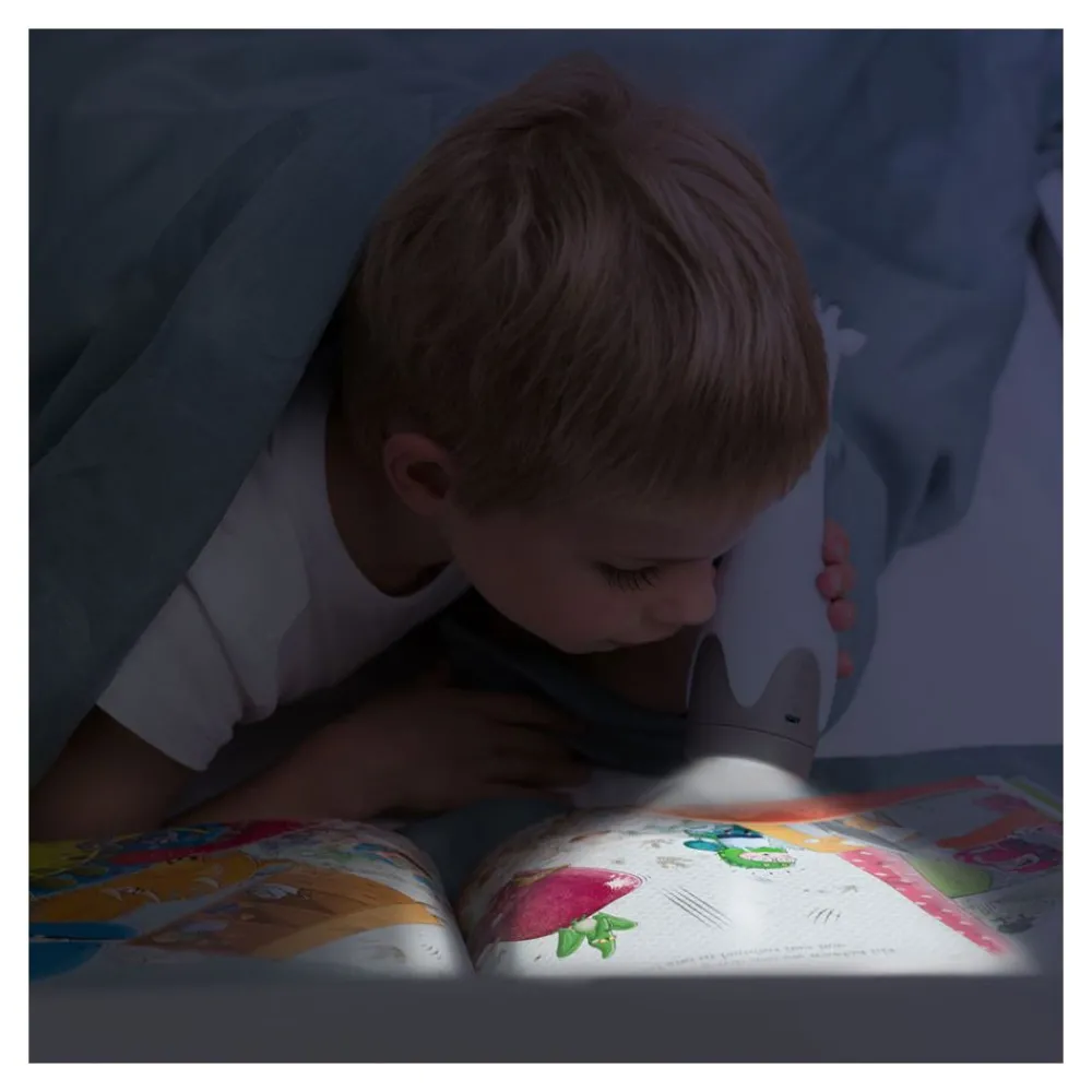 Giraffen Gina er en søt og praktisk lommelykt og nattlampe i ett. Lommelykten kan underholde eller ledsage i mørket, og har automatisk avstenging.
