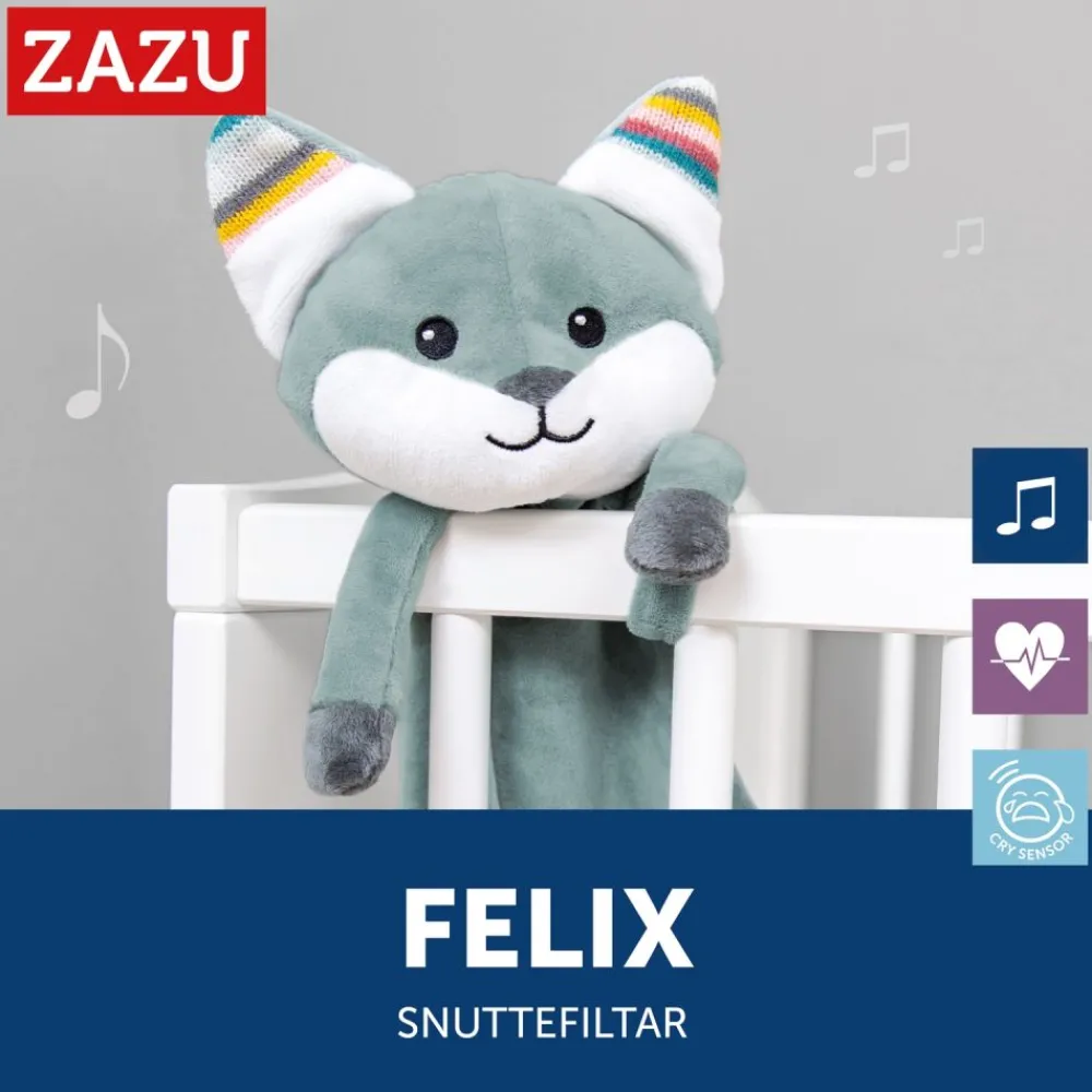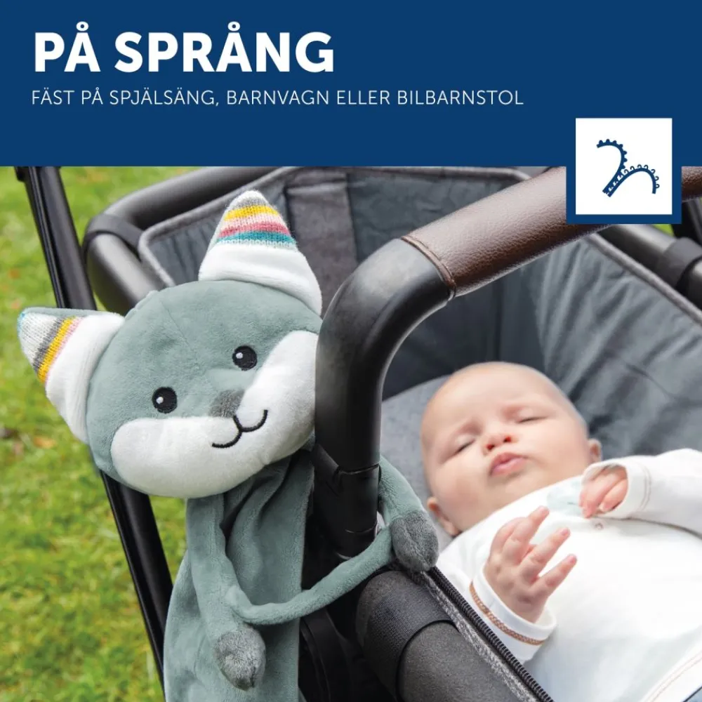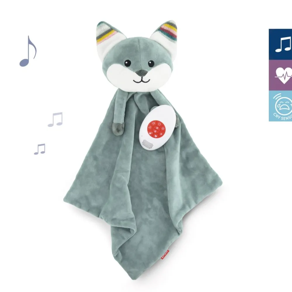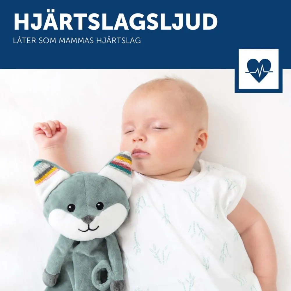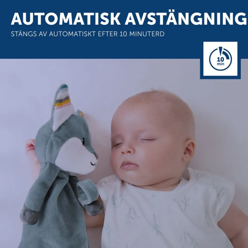 Et mykt smokketeppe med beroligende musikk som du kan ta med deg overalt. Du kan også feste smokken til den lille, slik at den ikke går tapt. Velg mellom hjerteslaglyder, hvit støy, naturlyder eller 3 beroligende vuggeviser. Timerfunksjonen slås av automatisk etter 10 minutter, mens gråtsensoren sørger for at den sist spilte lyden slås på igjen når babyen din gråter. Volumet kan justeres. Med borrelås kan du feste denne kosekluten til barnevognen, bilsetet eller vuggen.